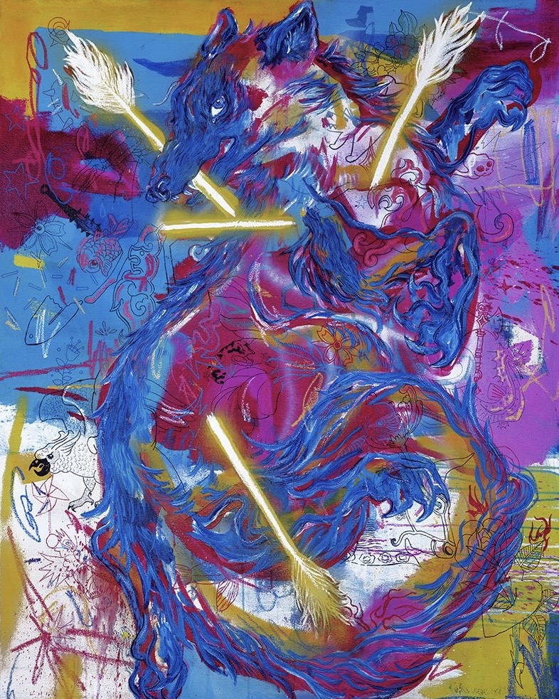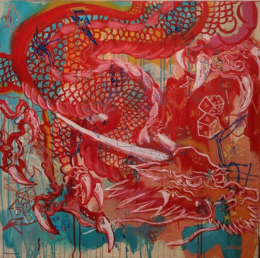 Andrea Velasco-Astete’s practice is rooted in neo-expressionism, marked by raw brushwork and emotional intensity. Her work explores the convergence of the contemporary and the classical, connecting diverse cultures and temporalities through symbolic forms and symbols.