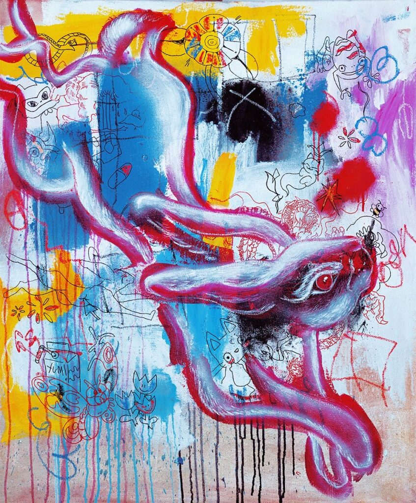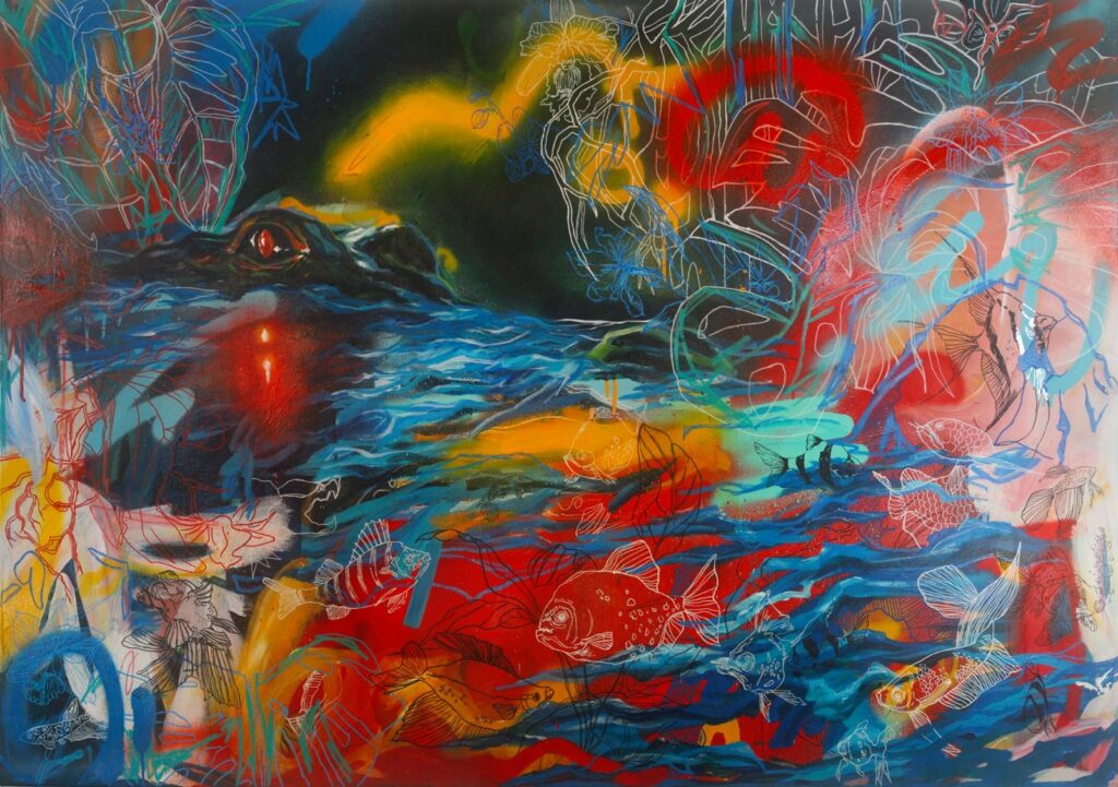 Utilizando las técnicas de «arte inacabado» y «pentimenti», revela intencionalmente las huellas de etapas anteriores, haciendo visible el proceso e invitando a una mirada lenta y atenta. Su lenguaje visual transcultural mezcla mitología, folclore y memoria personal, creando narrativas fragmentadas que habitan entre mundos, identidades y estados emocionales.